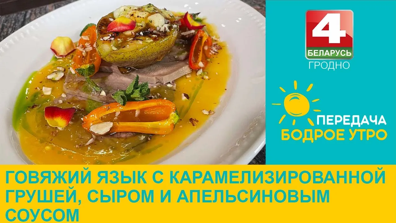 06:05Бодрое утро. Блюдо дня. Говяжий язык с карамелизированной грушей, сыром и апельсиновым соусом.Телерадиокомпания Гродно20.03.202378 праглядаў